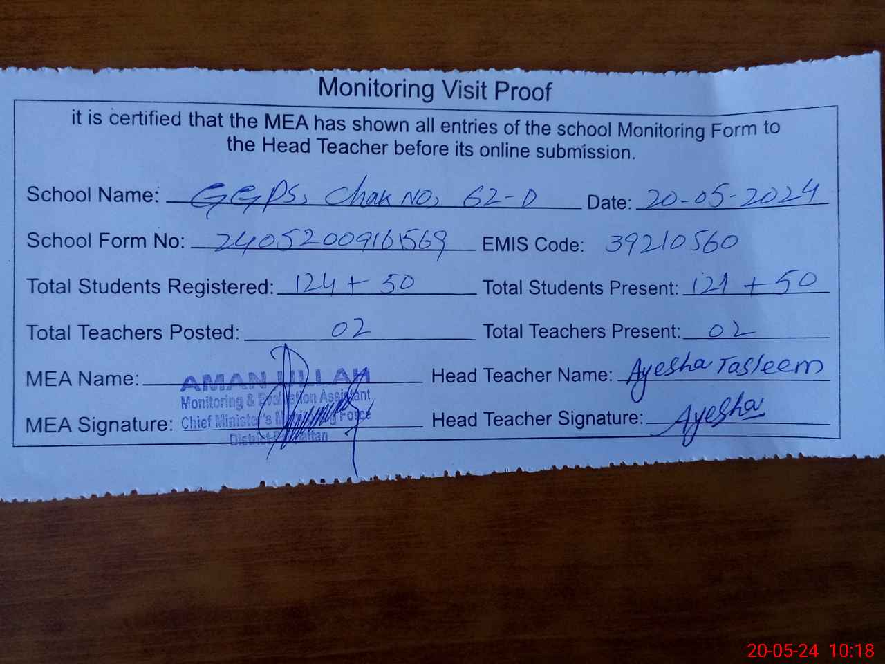 | Attendance Register | Head Teacher | MEA with School | Visit Proof |