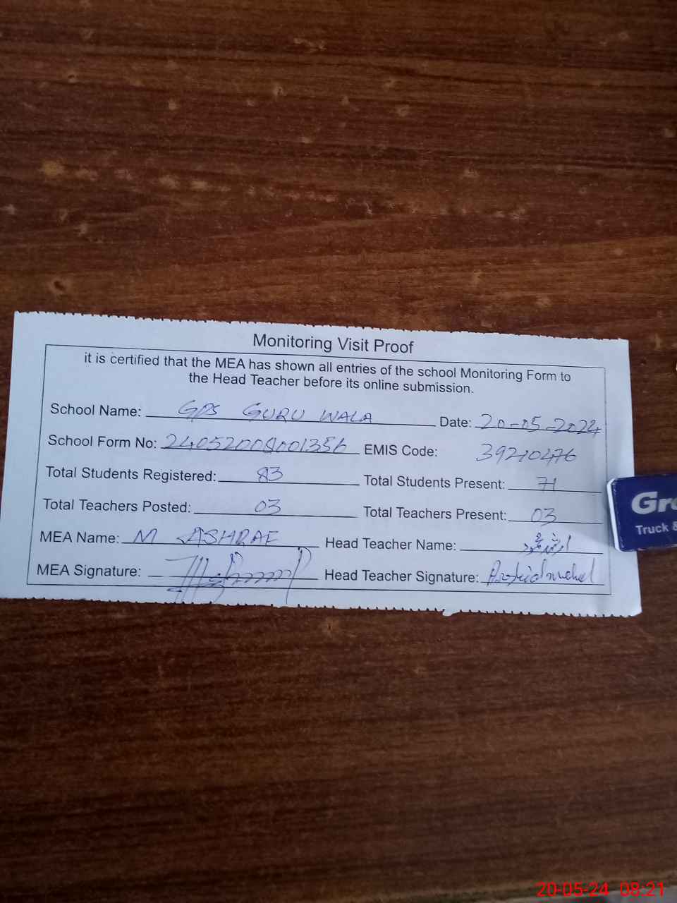 | EMIS Code: 39210476 | Name of School: GPS GURU WALA | |||