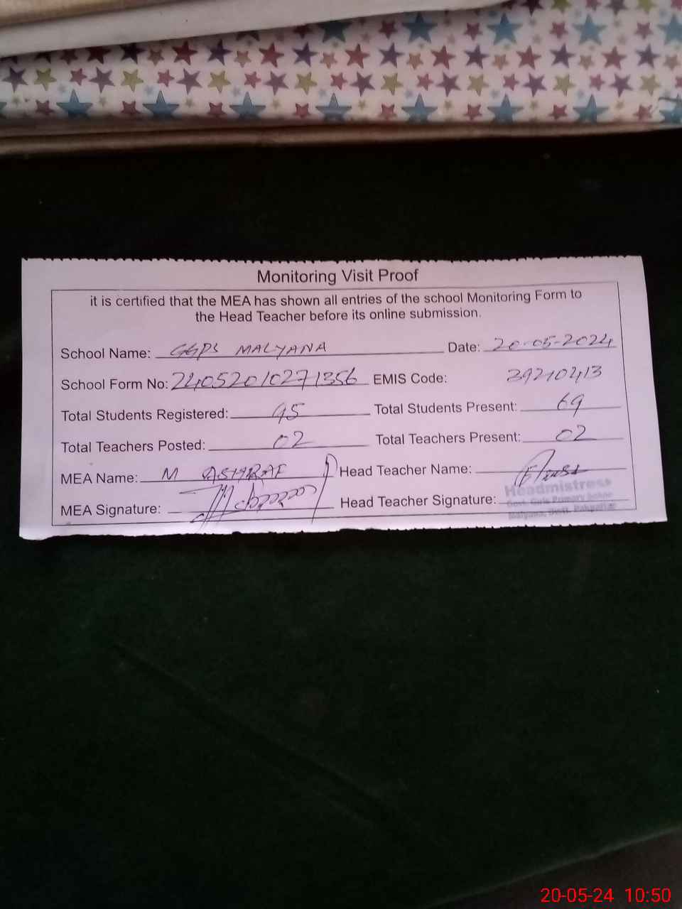 | Attendance Register | Head Teacher | MEA with School | Visit Proof |
