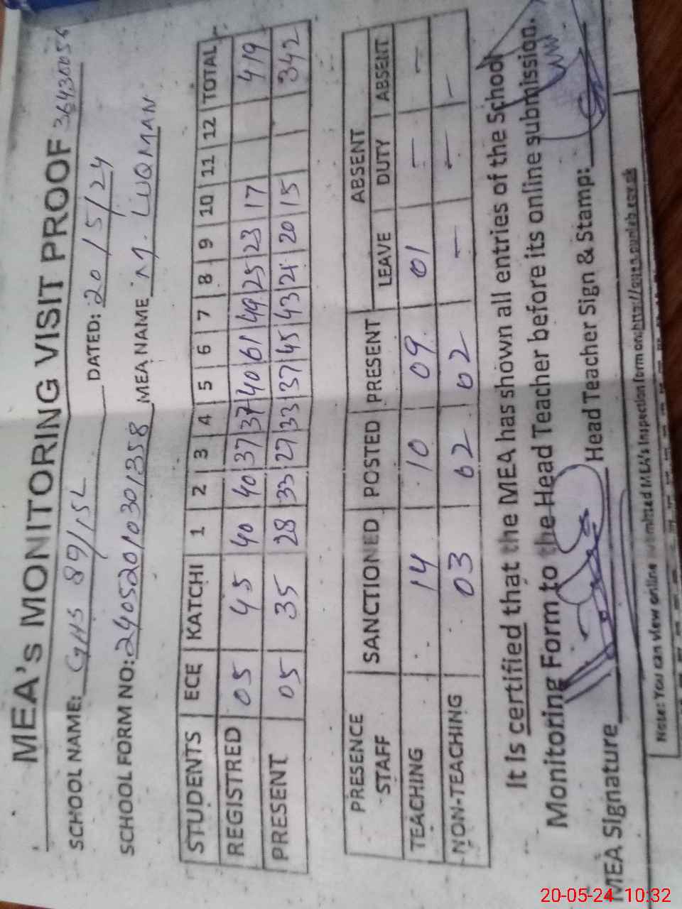 | Certified that this School was Inspected by the Undersigned MEA/DMO Today and the Information Stated Above is as Per Record. | |||||