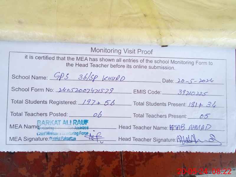 | EMIS Code: 39210225 | Name of School: GPS CHAK NO. 36/SP KHURD | |||