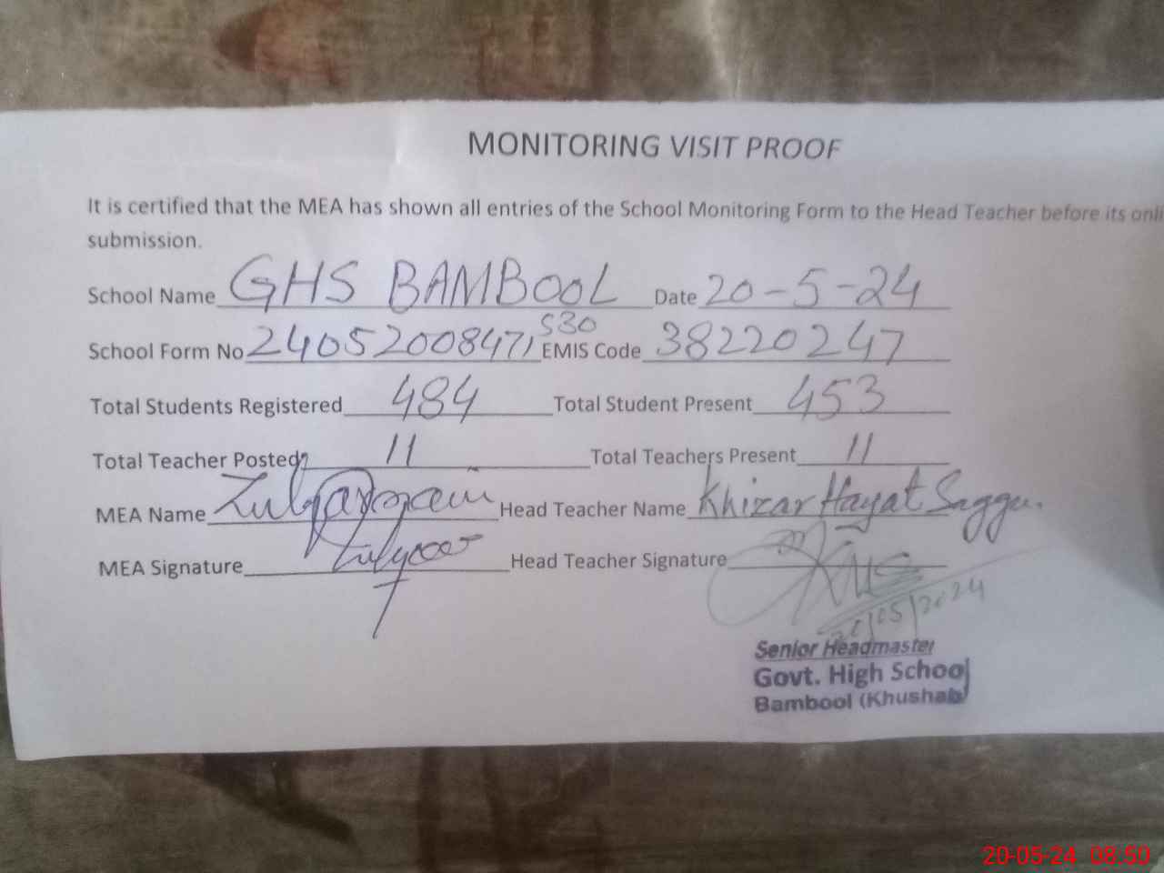| Attendance Register | Head Teacher | MEA with School | Visit Proof |