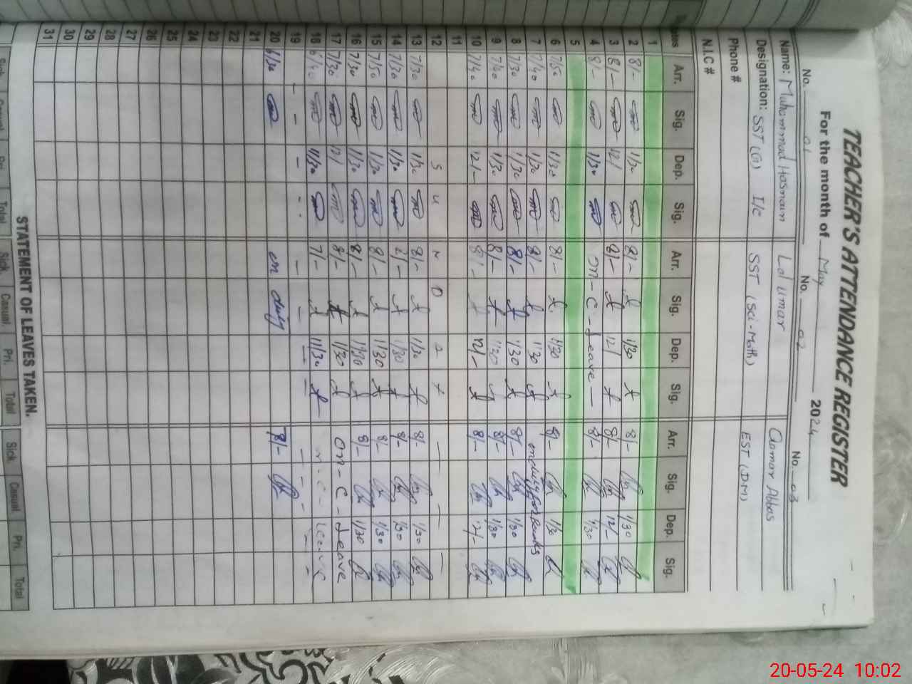 | CNIC | Full Name | Designation | R/C | Absence During Last Calender Month |