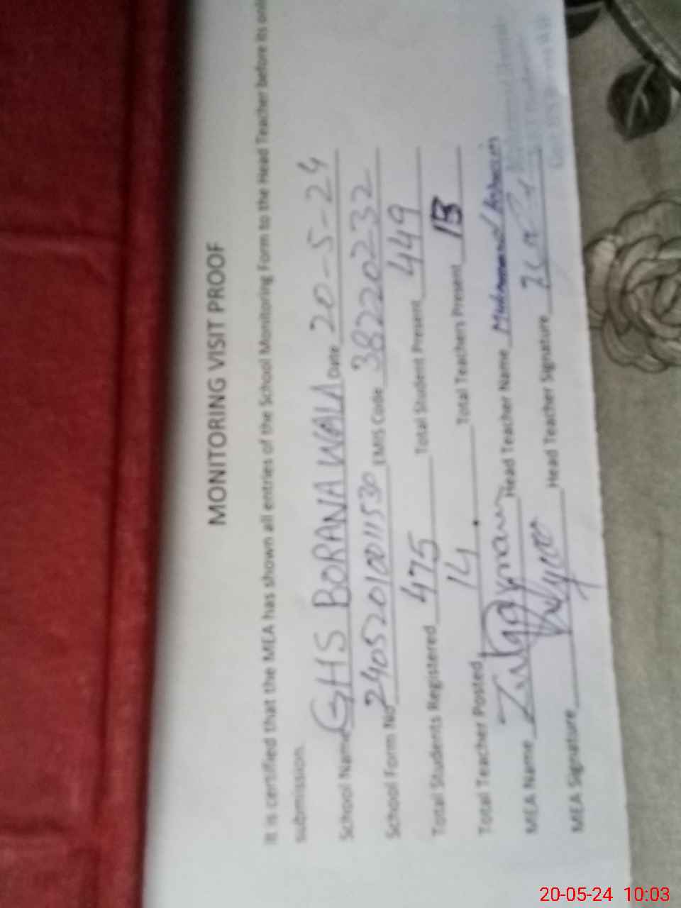 | Attendance Register | Head Teacher | MEA with School | Visit Proof |