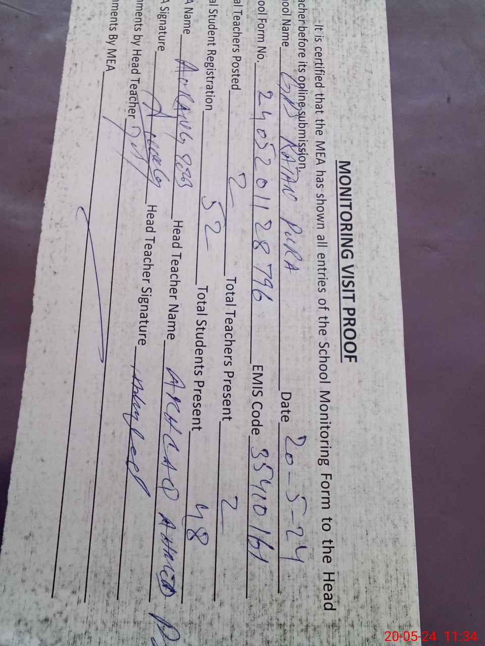 | Attendance Register | Head Teacher | MEA with School | Visit Proof |