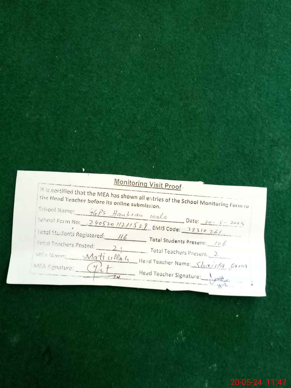 | Attendance Register | Head Teacher | MEA with School | Visit Proof |