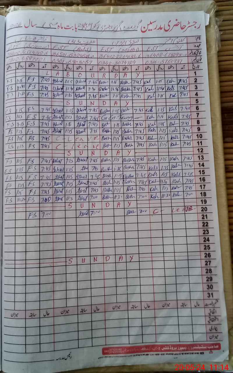 | CNIC | Full Name | Designation | R/C | Absence During Last Calender Month |