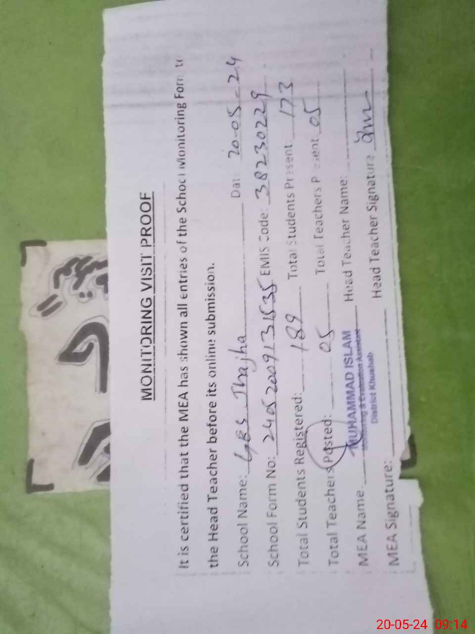 | Attendance Register | Head Teacher | MEA with School | Visit Proof |