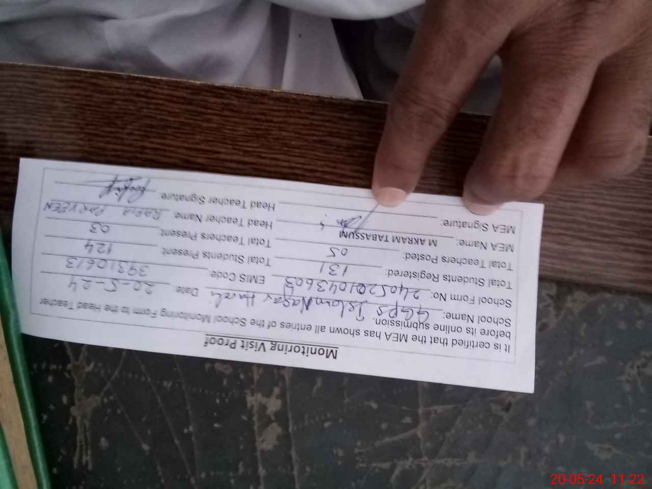 | Attendance Register | Head Teacher | MEA with School | Visit Proof |