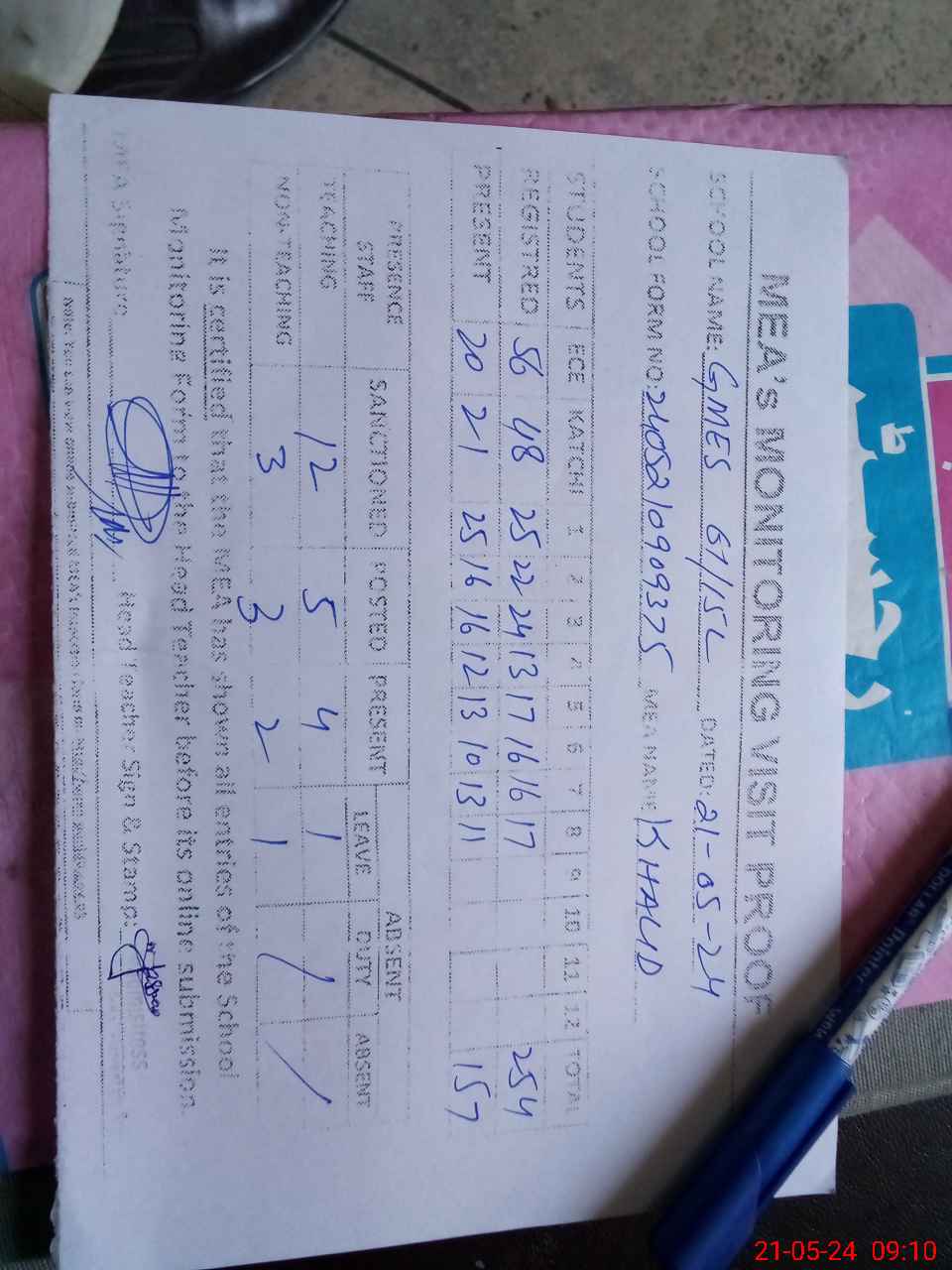 | Attendance Register | Head Teacher | MEA with School | Visit Proof |
