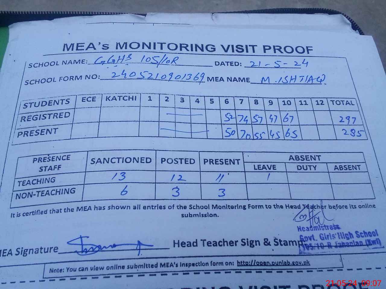 | Attendance Register | Head Teacher | MEA with School | Visit Proof |