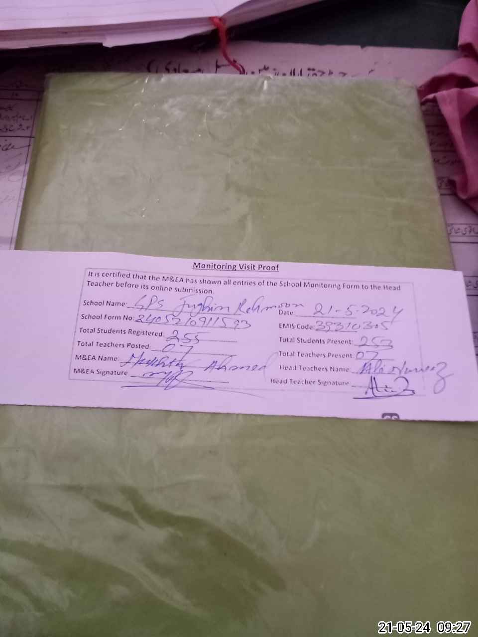 | Attendance Register | Head Teacher | MEA with School | Visit Proof |
