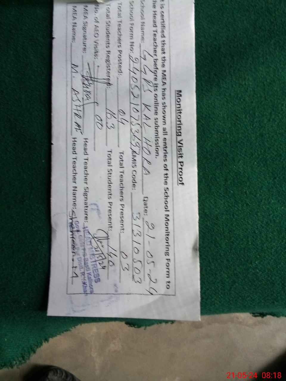 | Attendance Register | Head Teacher | MEA with School | Visit Proof |