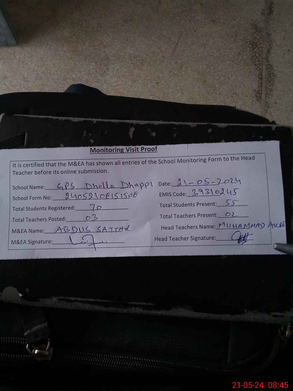 | Attendance Register | Head Teacher | MEA with School | Visit Proof |