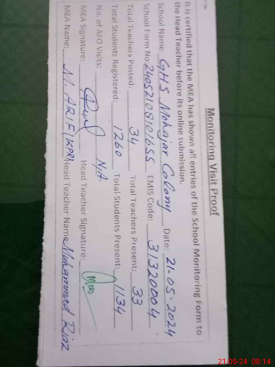 | EMIS Code: 31320004 | Name of School: GHS MOHAJAR COLONY | |||