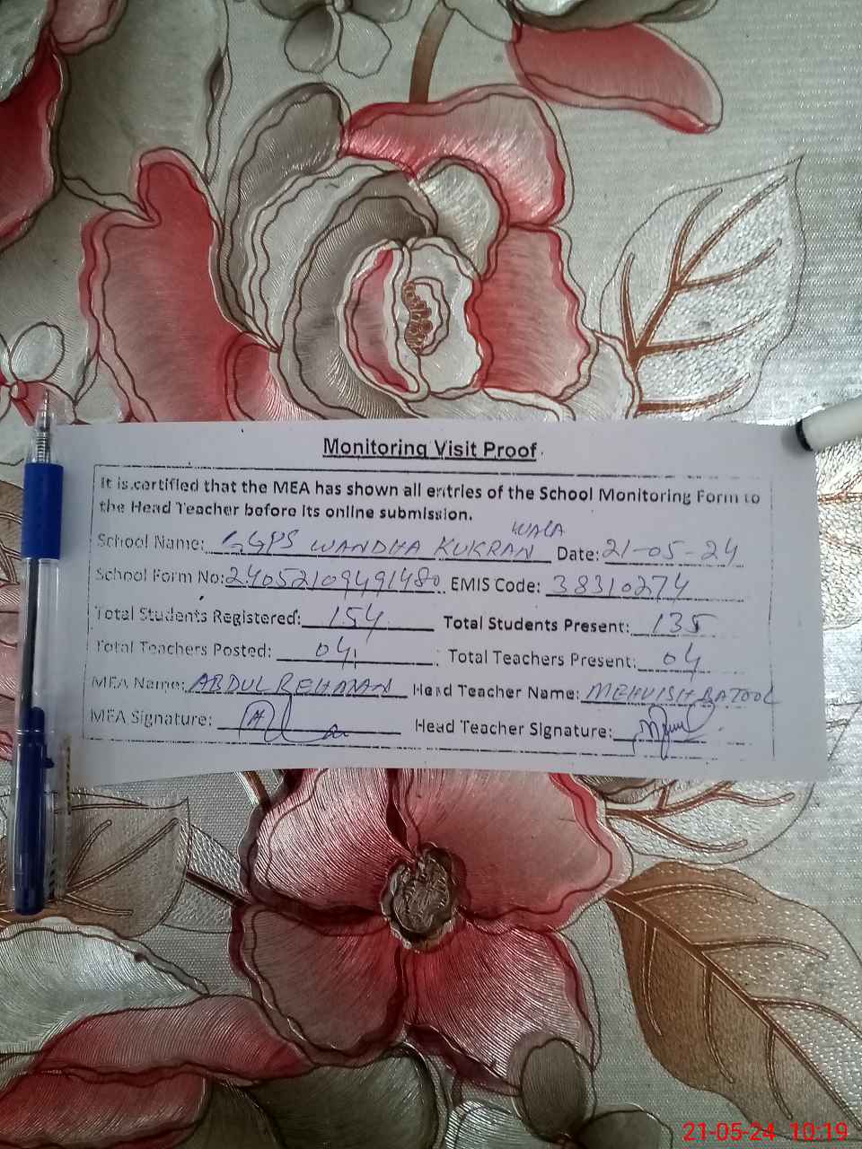 | Attendance Register | Head Teacher | MEA with School | Visit Proof |