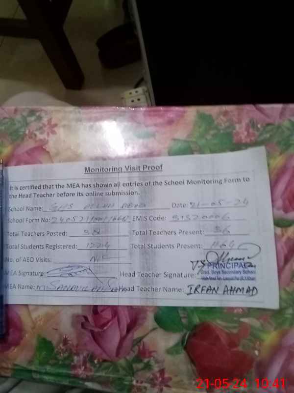 | Certified that this School was Inspected by the Undersigned MEA/DMO Today and the Information Stated Above is as Per Record. | |||||