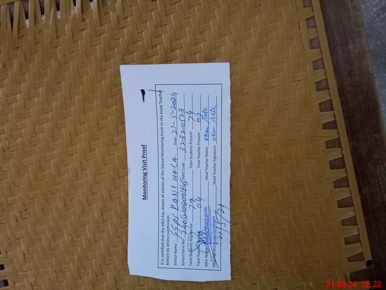 | Attendance Register | Head Teacher | MEA with School | Visit Proof |