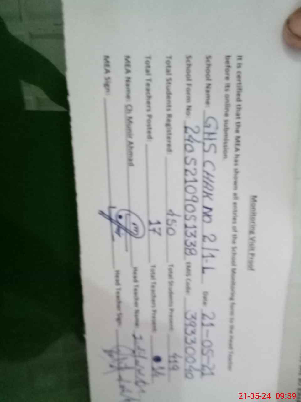 | Certified that this School was Inspected by the Undersigned MEA/DMO Today and the Information Stated Above is as Per Record. | |||||