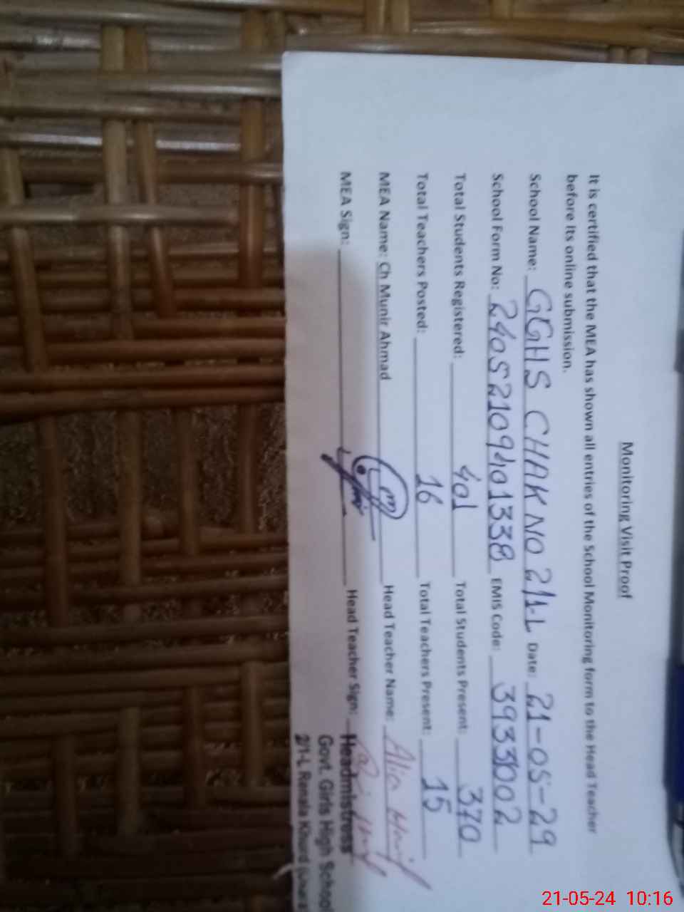 | Certified that this School was Inspected by the Undersigned MEA/DMO Today and the Information Stated Above is as Per Record. | |||||