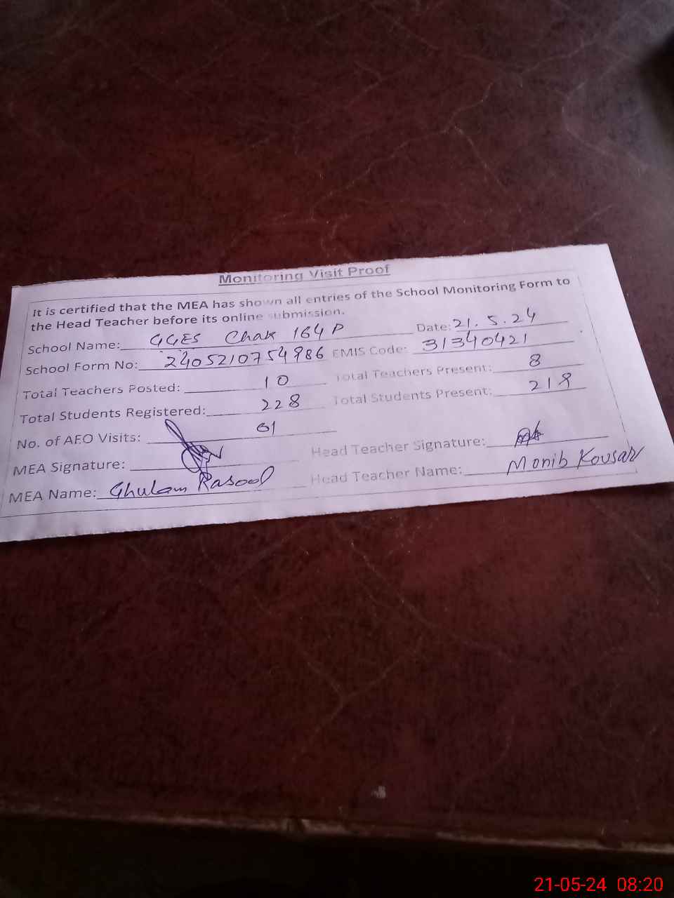 | Attendance Register | Head Teacher | MEA with School | Visit Proof |