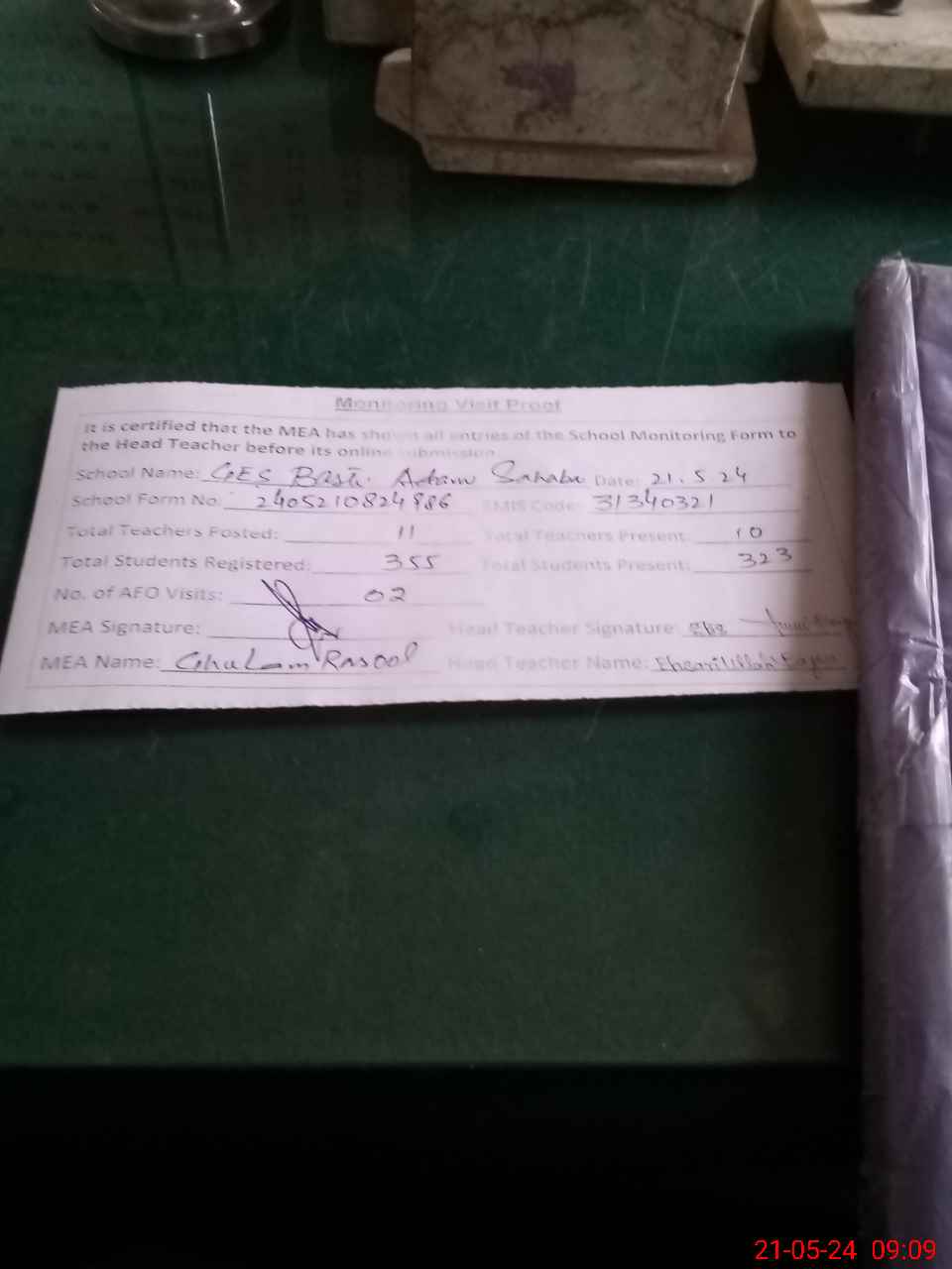 | Attendance Register | Head Teacher | MEA with School | Visit Proof |