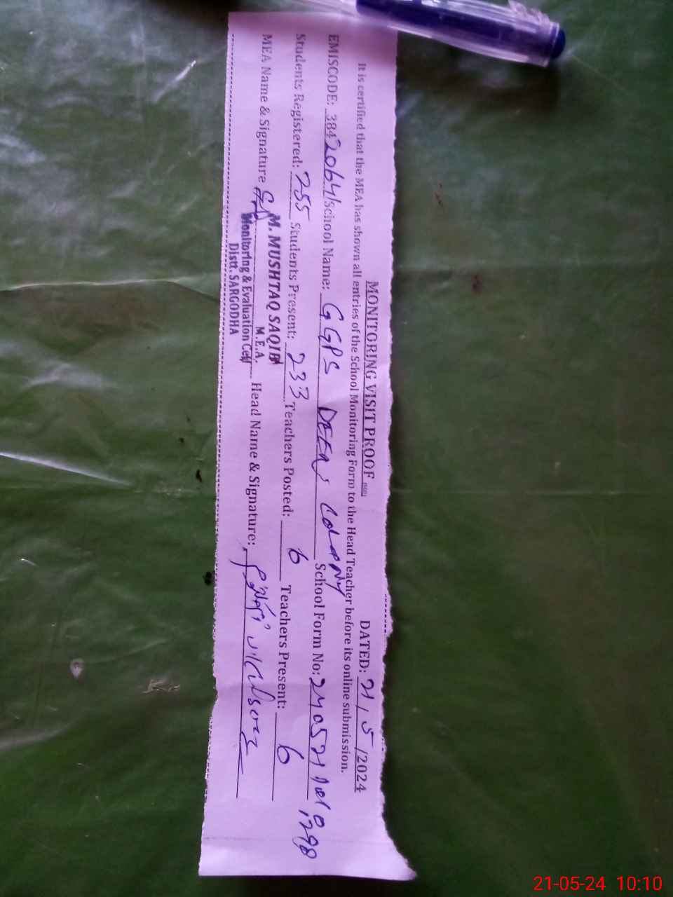 | Certified that this School was Inspected by the Undersigned MEA/DMO Today and the Information Stated Above is as Per Record. | |||||