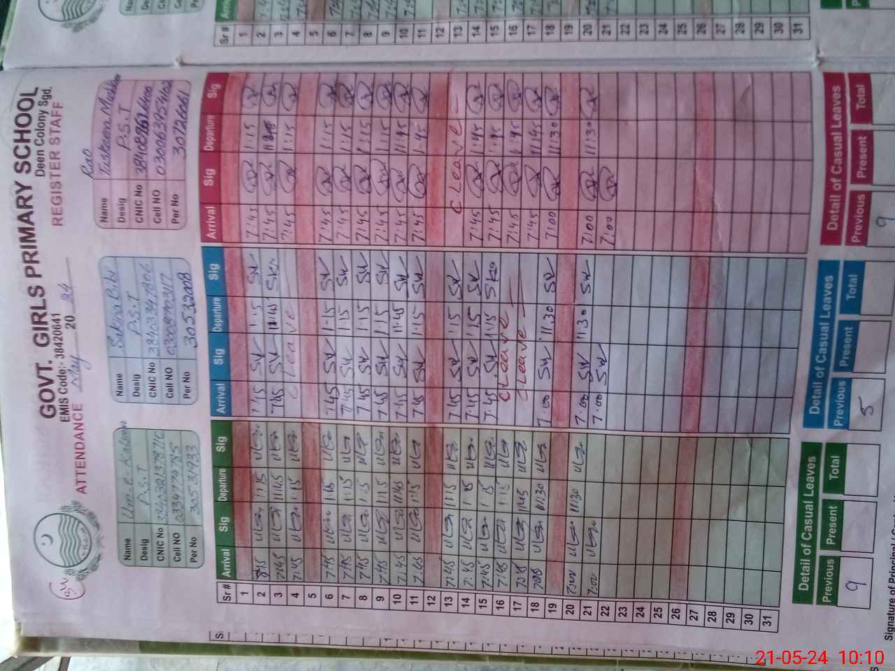 | CNIC | Full Name | Designation | R/C | Absence During Last Calender Month |