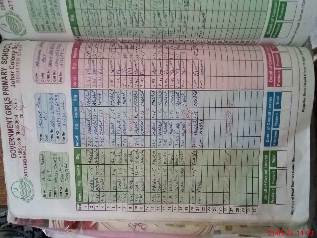 | CNIC | Full Name | Designation | R/C | Absence during last cal. month |