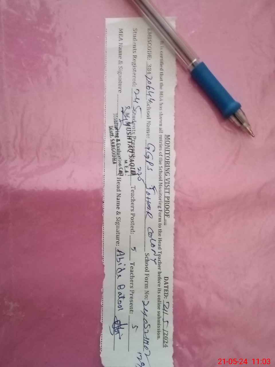 | Name: Ma**** Bi**** Designation: (School Headmaster's/Headmistress's) PST Phone/Cell Number: 03**** |