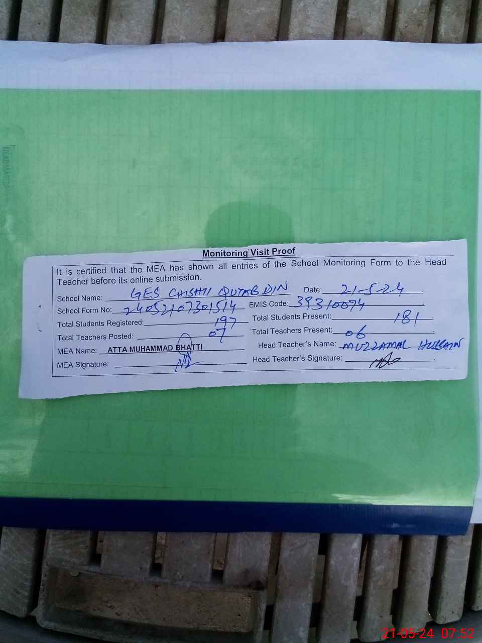 | Attendance Register | Head Teacher | MEA with School | Visit Proof |