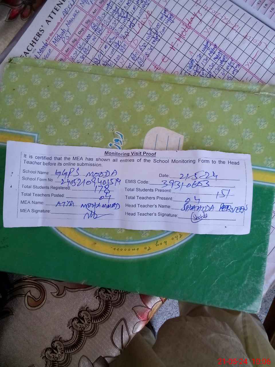 | Attendance Register | Head Teacher | MEA with School | Visit Proof |