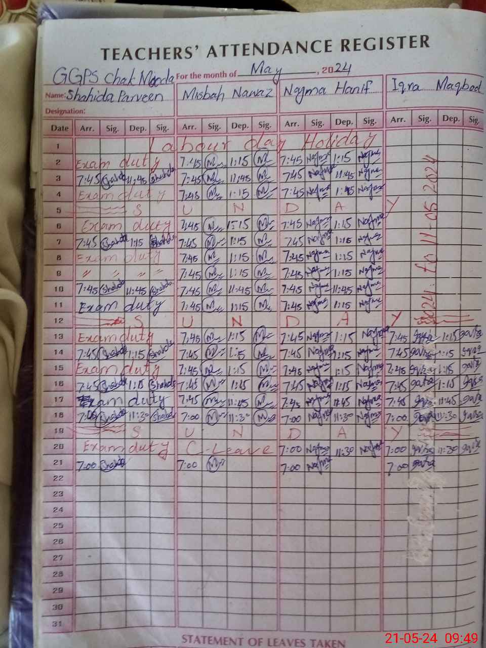 | Leave | Duty | Absent | Maternity | Medical | Ex- Pak |