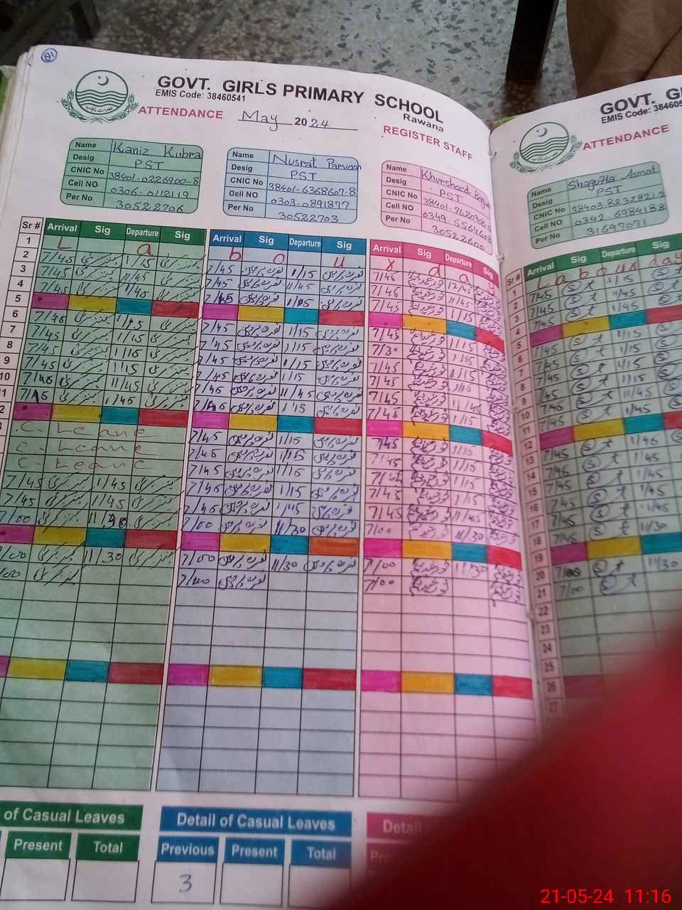 | CNIC | Full Name | Designation | R/C | Absence During Last Calender Month |