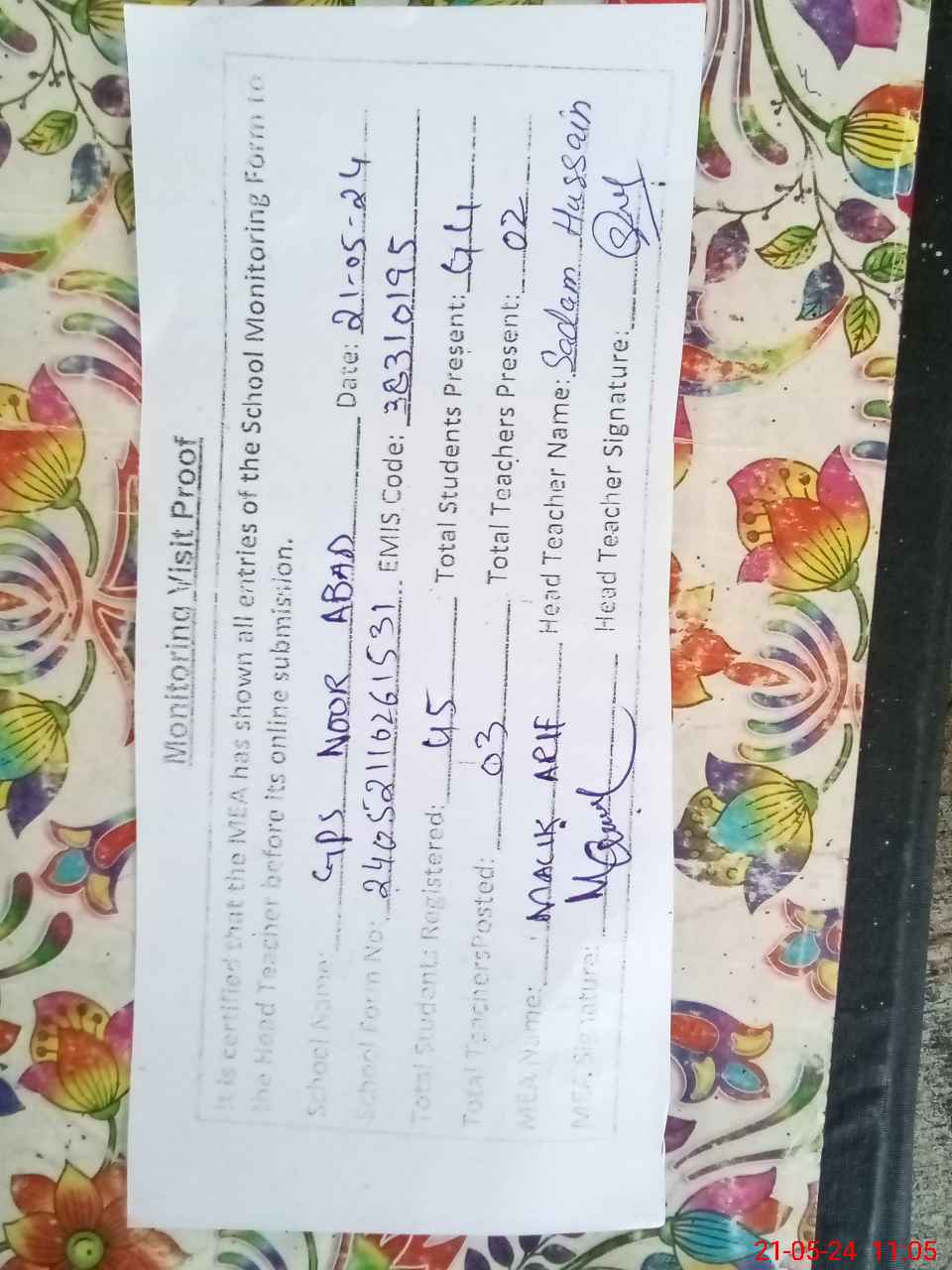 | Attendance Register | Head Teacher | MEA with School | Visit Proof |