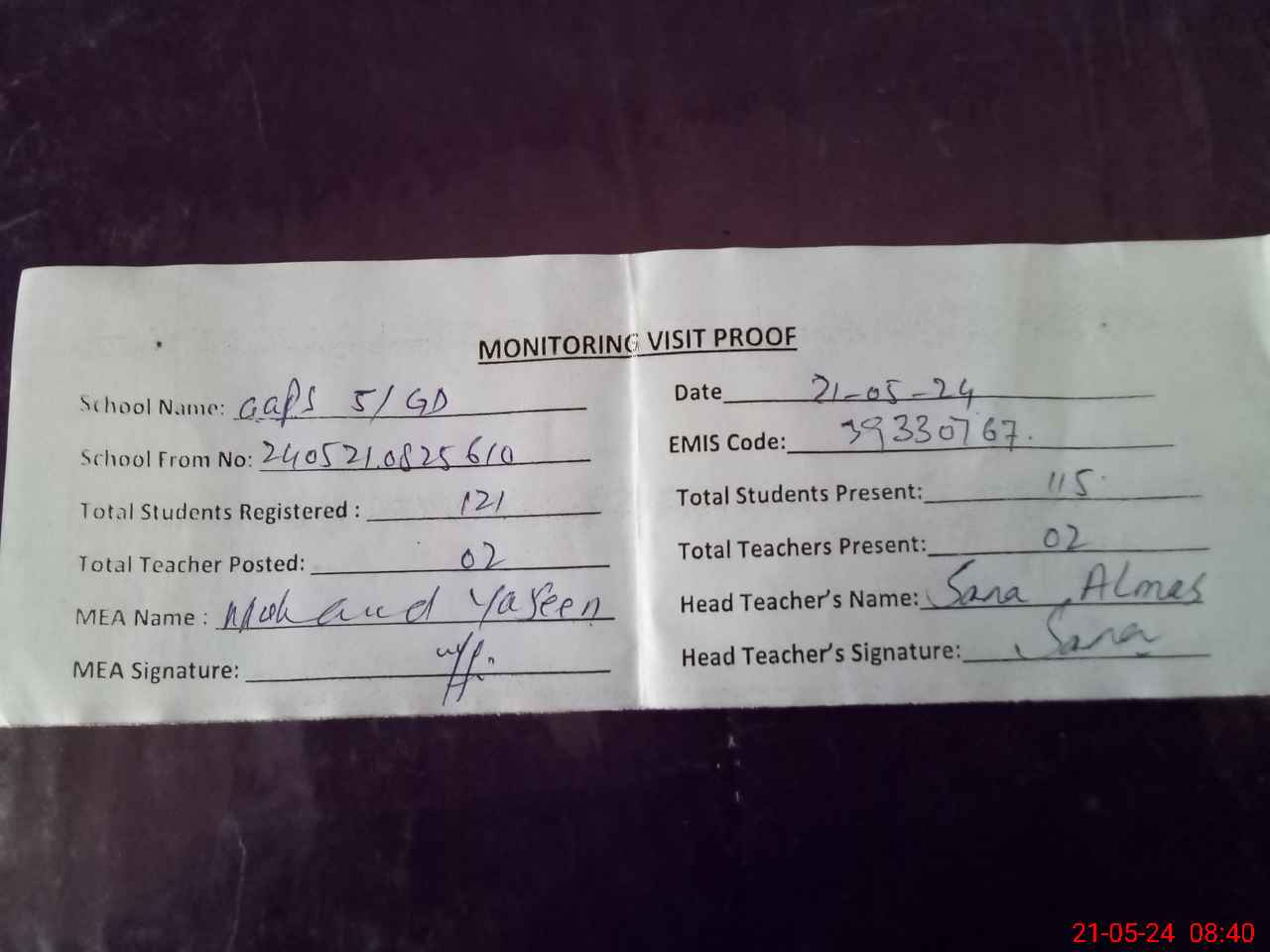 | Attendance Register | Head Teacher | MEA with School | Visit Proof |