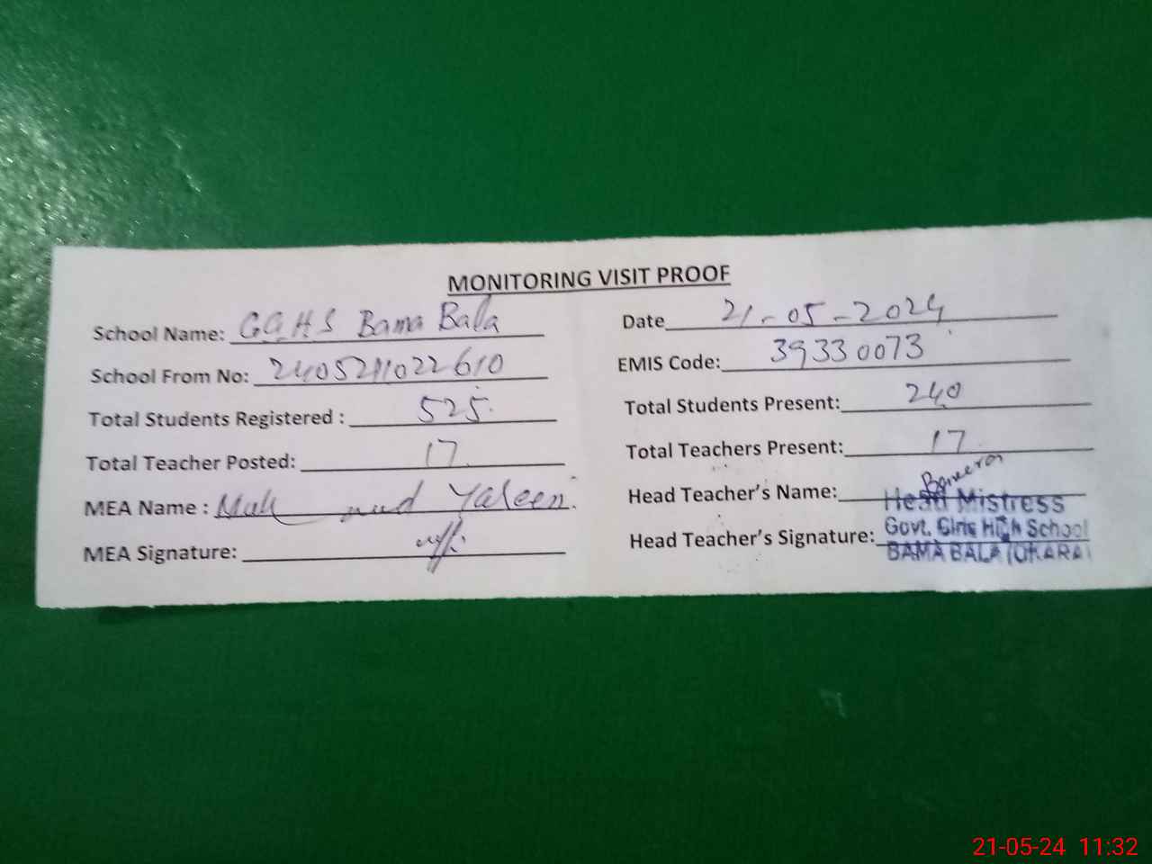 | Certified that this School was Inspected by the Undersigned MEA/DMO Today and the Information Stated Above is as Per Record. | |||||