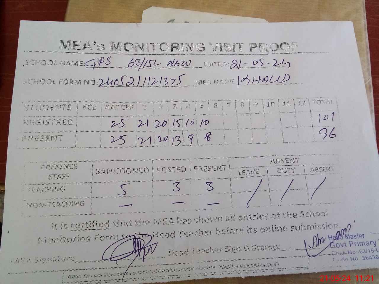 | Attendance Register | Head Teacher | MEA with School | Visit Proof |