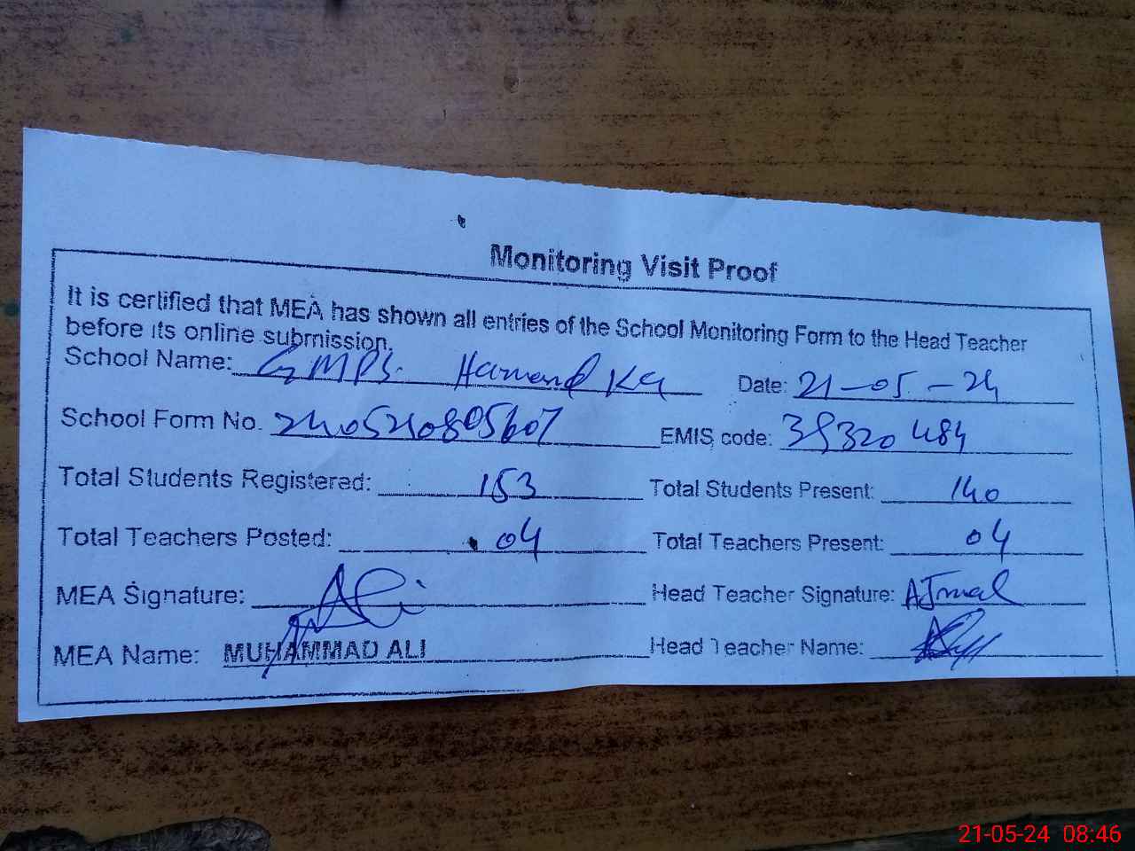 | Attendance Register | Head Teacher | MEA with School | Visit Proof |