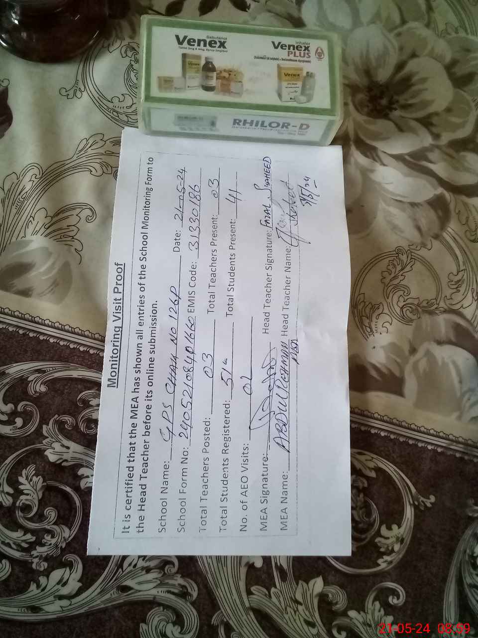 | Attendance Register | Head Teacher | MEA with School | Visit Proof |