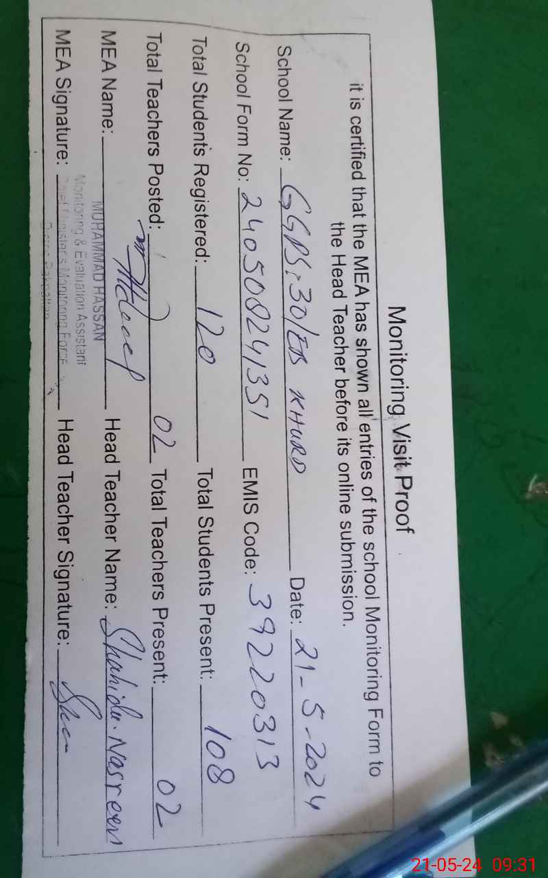 | EMIS Code: 39220313 | Name of School: GGPS CHAK 30/EB KHURD P/O 30/EB KALAN | |||