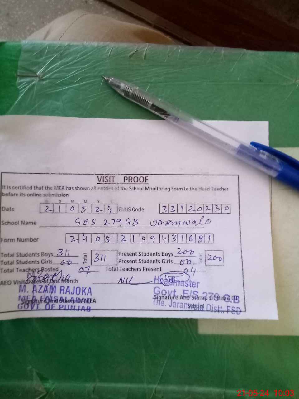 | Attendance Register | Head Teacher | MEA with School | Visit Proof |