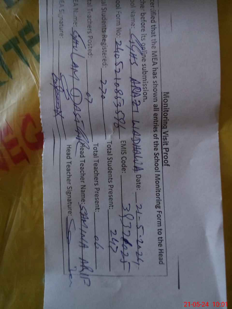 | Attendance Register | Head Teacher | MEA with School | Visit Proof |