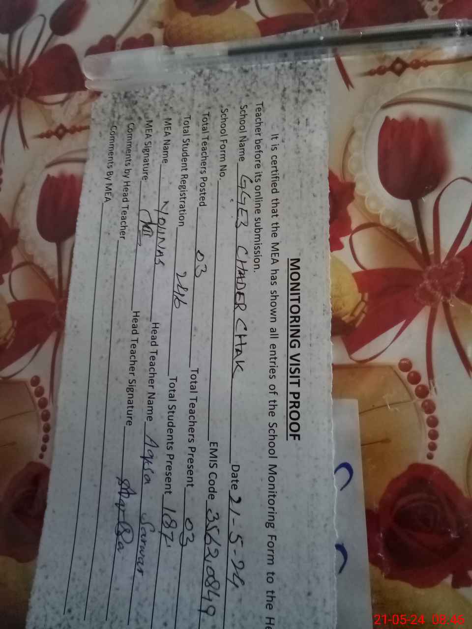 | Attendance Register | Head Teacher | MEA with School | Visit Proof |