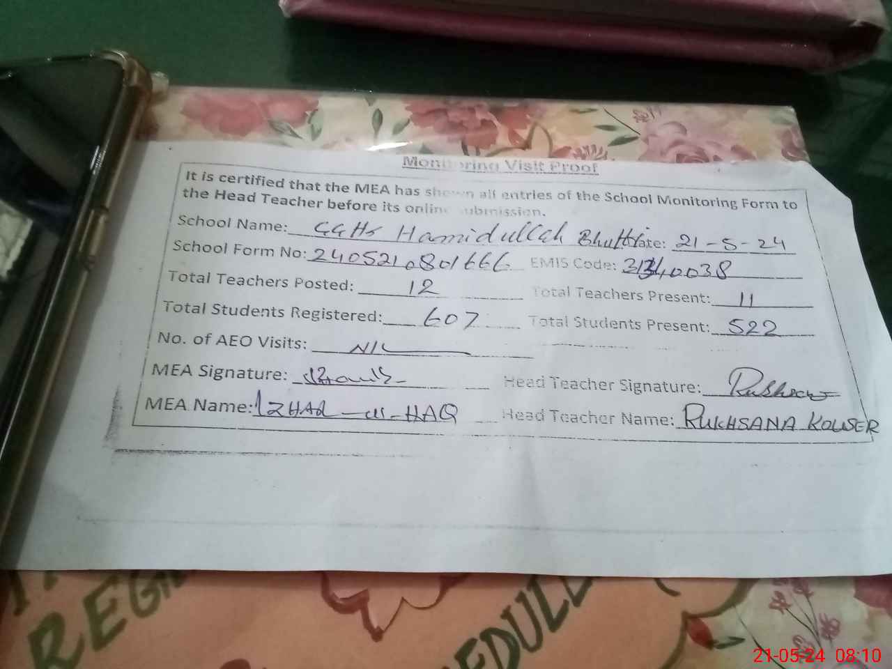 | Attendance Register | Head Teacher | MEA with School | Visit Proof |