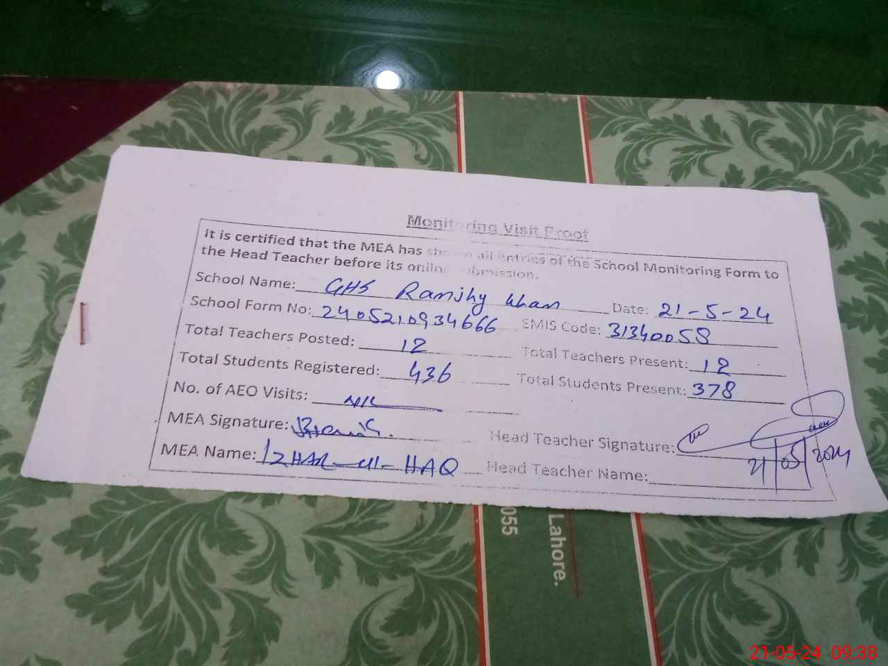 | EMIS Code: 31340058 | Name of School: GHS RANJHAY KHAN | |||