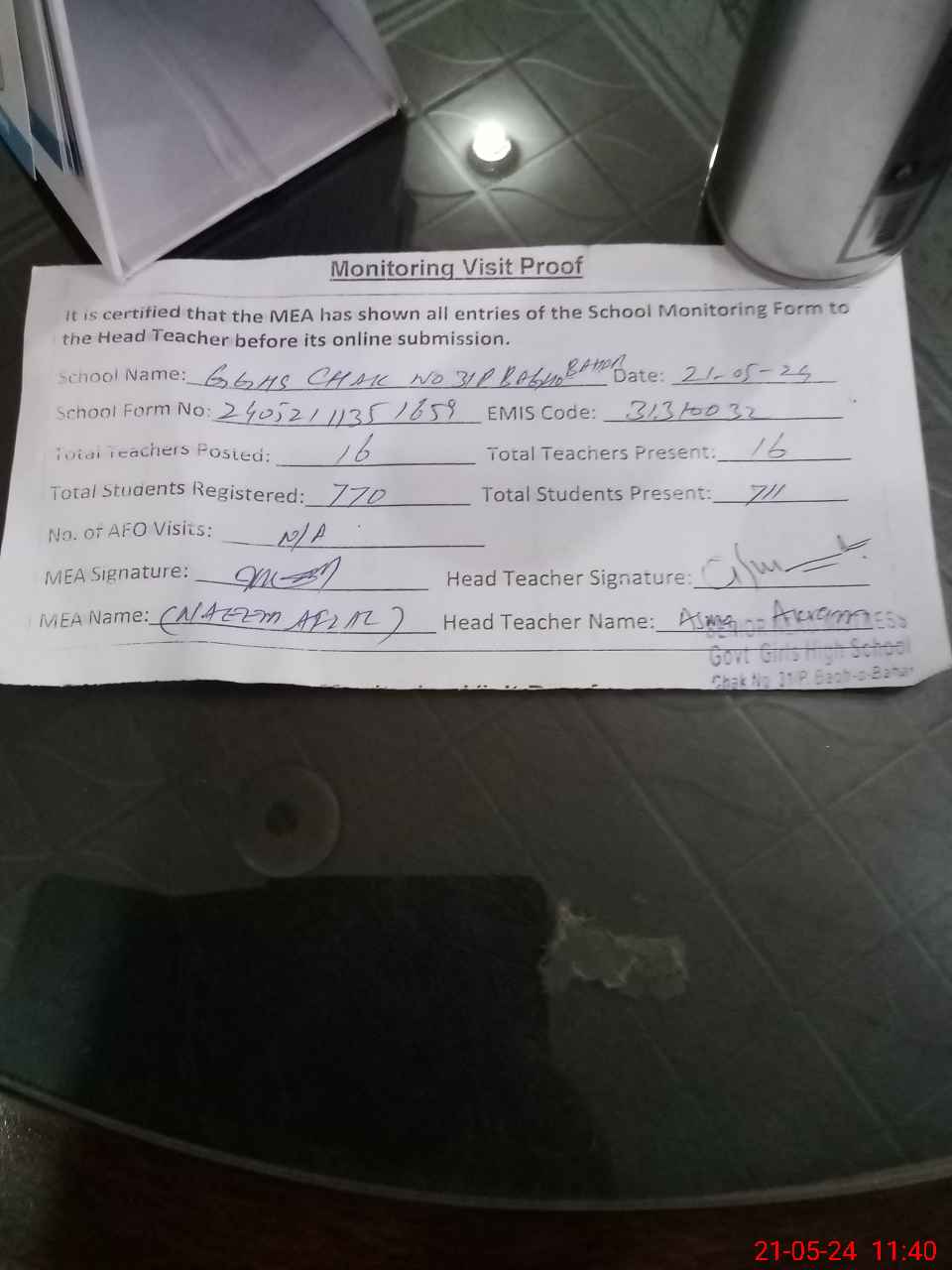 | Attendance Register | Head Teacher | MEA with School | Visit Proof |