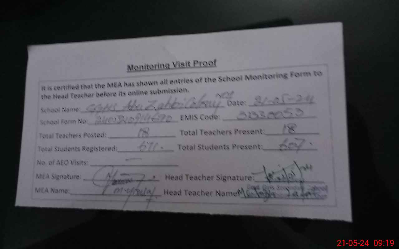 | Attendance Register | Head Teacher | MEA with School | Visit Proof |