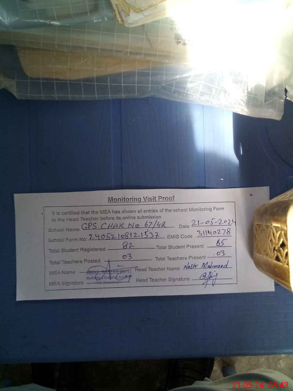 | Attendance Register | Head Teacher | MEA with School | Visit Proof |