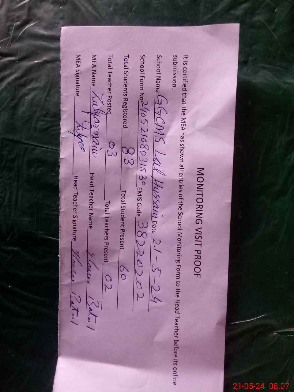 | Attendance Register | Head Teacher | MEA with School | Visit Proof |